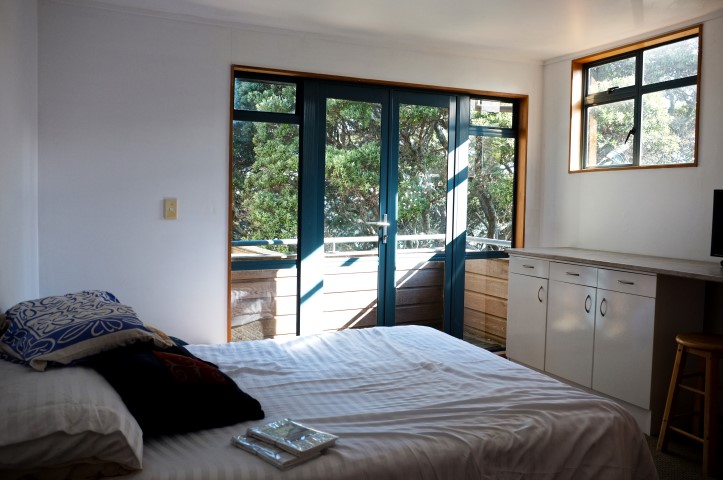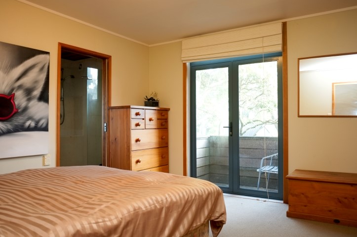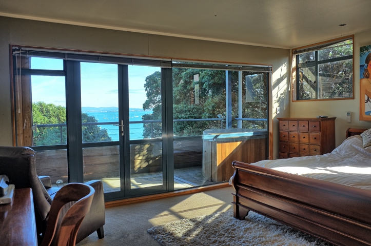 The master bedroom has stunning views out through the trees and over the harbour, its own private deck equip with a spa and a sauna.