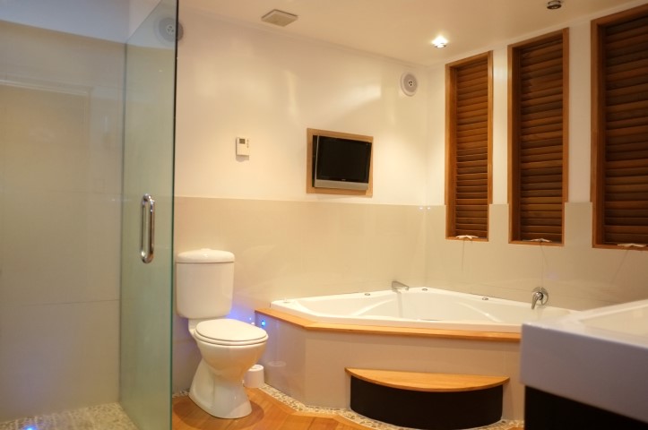 Down the hall is a stunning modern bathroom, with shower, dual basins, spa bath and wall mounted TV so you can watch the footy (or the soaps) while enjoying a relaxing bath.