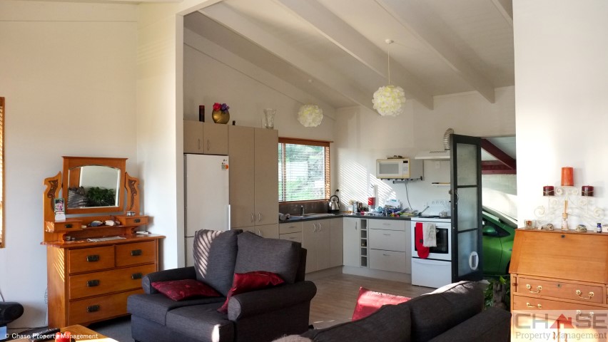 Enter in the front door and you are greeted by open plan kitchen and Living area that is fresh and clean and has a heat pump, the north facing side has a decking area to while away the afternoon.